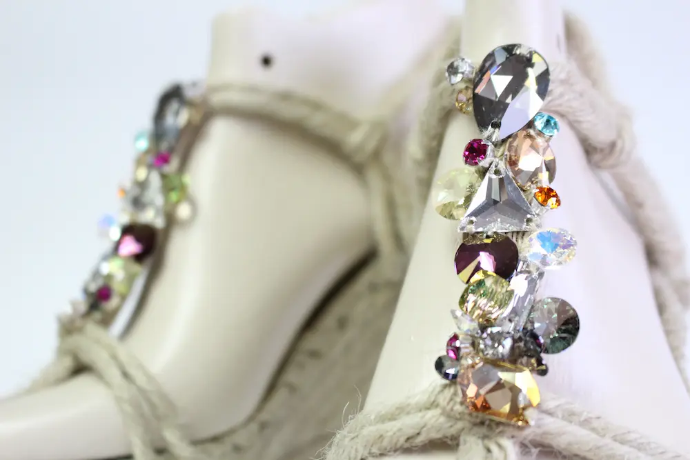 BOUQUET es una de nuestros Sandalias “joya”, un deleite de luminosidad y confort. Su principal atributo, la pieza de cristales de Swarovski originales, diseñada, montada y cosida a mano en nuestro taller.